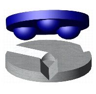 | The fully kinematic coupling represents the gold standard of couplings by using individual point contacts that each constrain a single degree of freedom. Because the interaction between the interface surfaces can be described by six distinct points, closed loop mathematics can be formulated to deterministically describe the relationship between the surfaces. In reality, point contacts must typically tolerate high loads, therefore the theoretical point contacts deform into Hertzian contact ellipses under large applied loads. The main limit to the repeatability of a kinematic coupling is the surface finish of the contact regions, while load capacity and stiffness are limited by the Hertzian contact stress. By far, the most common form of the standard kinematic coupling is the ball- groove coupling, which interfaces three balls on one component to three grooves on the opposing component. The balls and grooves are placed on the three points of a planar equilateral triangle with the triangle sides coincident to lines passing through the contact points. The typical coupling structure is shown below with the standard coupling geometry terminology.